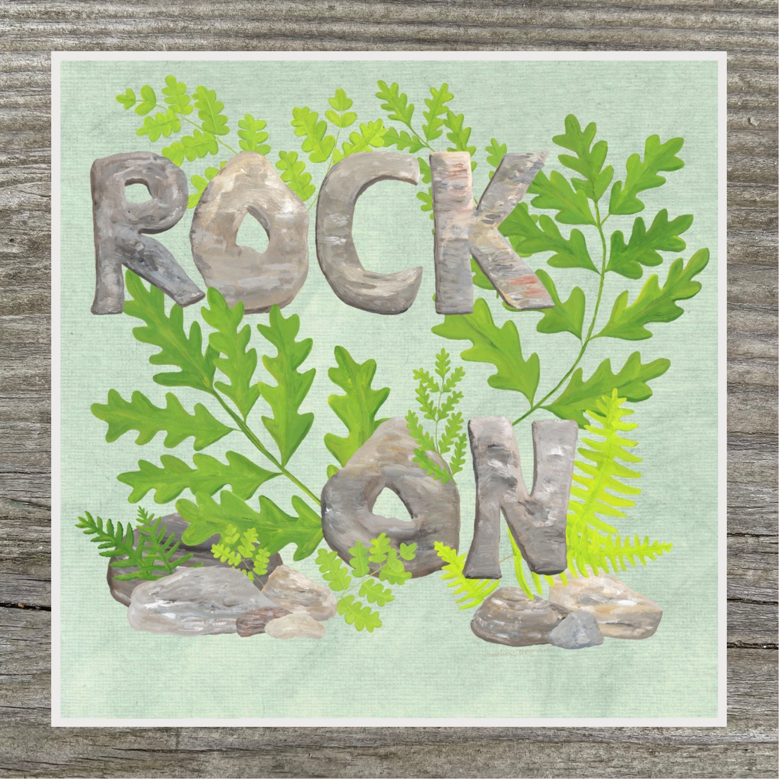 - Rock On print features hand painted rocks, lettering, and ferns. Elements were painted with highly pigmented acrylics. Background is watercolor painted canvas paper and has a canvas texture appearance in the print.